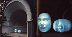 Anstelle eines Kurkonzerts zeigt Tony Oursler in der Konzertmuschel des Parks ein optisch-akustisches Intermezzo. Es heißt Shock-Rock. Was heißt das? Zu sehen sind eiförmige weiße Skulpturen, die durch Beamerprojektionen zu künstlichem Leben erweckt werden. Zwei proijezierte Köpfe einer Frau erscheinen, die in selbstbezogener Befangenheit vor sich her reden. Was sie zu sagen haben erinnert an assoziative Selbstgespräche wie sie jeder schon einmal, zum Beipiel kurz vor dem Einschlafen, erlebt hat. Ängste, Wünsche, Hoffnungen, Sehnsüchte, Bruchstücke aus eingebildeten Gesprächen, Splitter aus vorbeirauschenden Fernsehinformationen, existentielle Fragen und andere halb mentale und halb emotionale Zustände bilden eine ungewohnte, entrückte Atmosphäre. Die Frau scheint in jenem inneren Bezirk zu sein, in dem man mit sich allein ist, in dem keiner mir helfen oder mich berichtigen kann (wie Montaigne sagte).