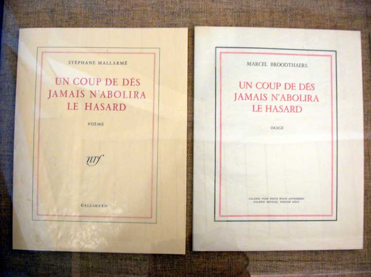 Sehr schön artikuliert das die Arbeit von Marcel Broodthaers, die dem Projekt den Titel gab: Un coup de dés - Image. Broodthaers hat im Jahre 1969 zu Stéphane Mallarmés Gedicht Un coup de dés jamais n'abolira le hasard (Der Würfelwurf hebt den Zufall niemals auf), in dem es um den Mensch geht, um den Mensch als ein Zufallswesen, das den Zufall leugnet, eine Bild-Version geschaffen, indem er alle Wörter und Buchstaben durch schwarze Balken ersetzt hat. Vor Augen hat man damit zwei Konstellationen, die eines Textes, der Bezeichnungen vorführt und die eines Bilderbuchs, das Formen präsentiert, womit, unter anderem, auch zwei verschiedene Denkformen angesprochen werden: das verbale und/oder begriffliche Denken und die Wahrnehmung, das Empfindungsdenken. Die Differenz zwischen Bild und Text reißt auf und zwar vor Augen.
